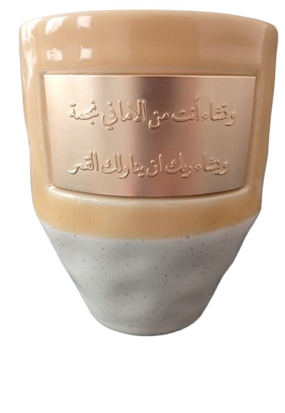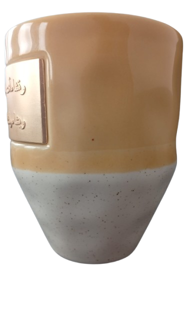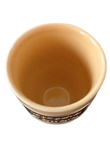 drinkbeker in keramiek, met arabisch opschrift van een ayah uit de Qur'aan.